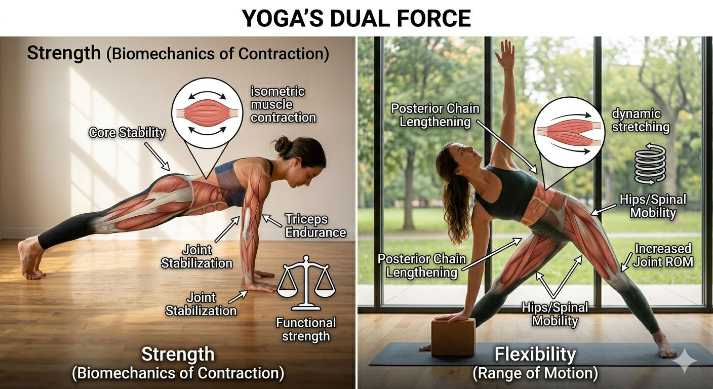 Yoga uses our body weight to build functional strength in our bodies. Unlike traditional gym training, it targets stabilizing muscles that are often neglected.